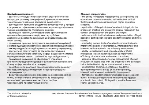 From 21 April to 31 May 2025, Dr Iryna V. Myhovych, Professor and Head of the International Relations Office at Luhansk Taras Shevchenko National University, took part in the international professional development programme “Soft Skills in Higher Education: EU Expertise”, implemented under the Jean Monnet Centre of Excellence of the Erasmus+ Programme “Hub of European Solutions” (Project No. 101127578 - HEUS - ERASMUS-JMO-2023-HEI-TCH-RSCH), hosted by the National University of Ostroh Academy.