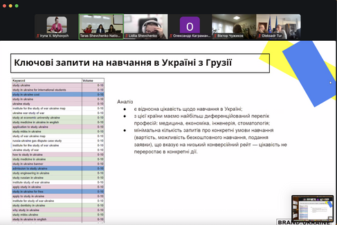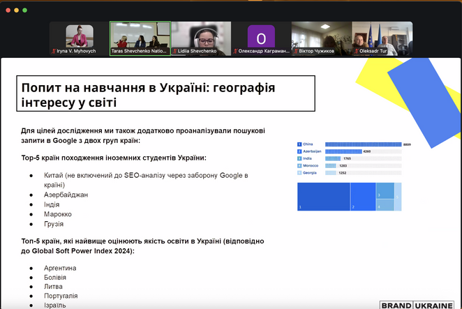 During the opening discussion, the NGO “Brand Ukraine” presented analytical data on the popularity of the Ukrainian market of educational services among international students. Based on SEO search trends in Google across Asia, Africa, Europe, and Latin America, the analysis confirmed a consistently high global interest in Ukrainian education. The most frequent queries included study in Ukraine, study mbbs in Ukraine, study medicine in Ukraine, study in Ukraine for international students, and study in Ukraine in English. A particularly high share of searches originates from India, the United States, Brazil, the United Kingdom, and Pakistan, which collectively account for over 40% of global demand. At the same time, it was emphasised that before the full-scale invasion, approximately 90,000 international students were studying in Ukraine, while today this number has decreased to around 20,000, highlighting the need for systemic actions to restore Ukraine’s position in the global educational space.